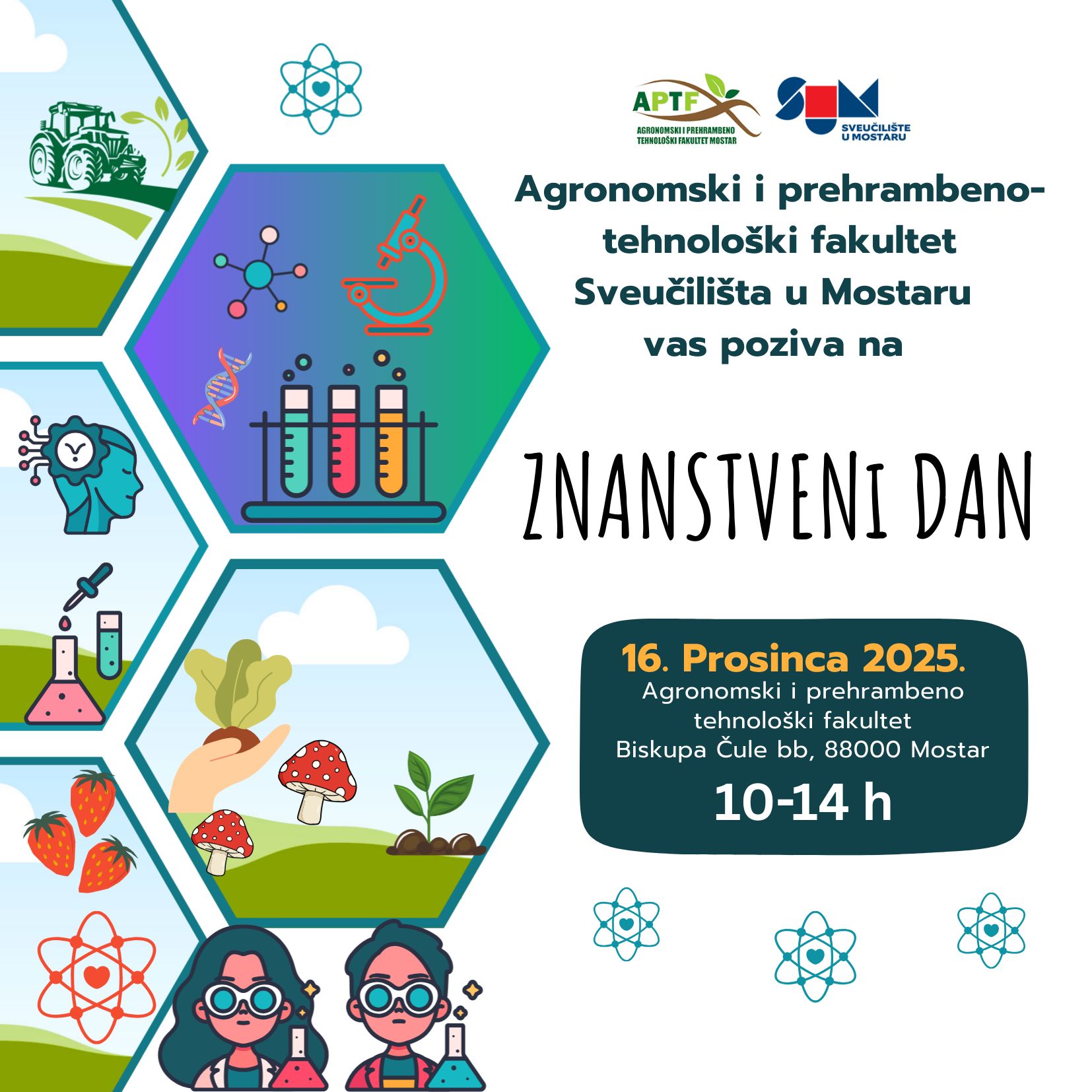 Agronomski i prehrambeno-tehnološki fakultet Sveučilišta u Mostaru organizira Znanstveni dan koji će se održati u utorak, 16. prosinca 2025. godine, u vremenu od 10 do 14 sati u zgradi Fakulteta.