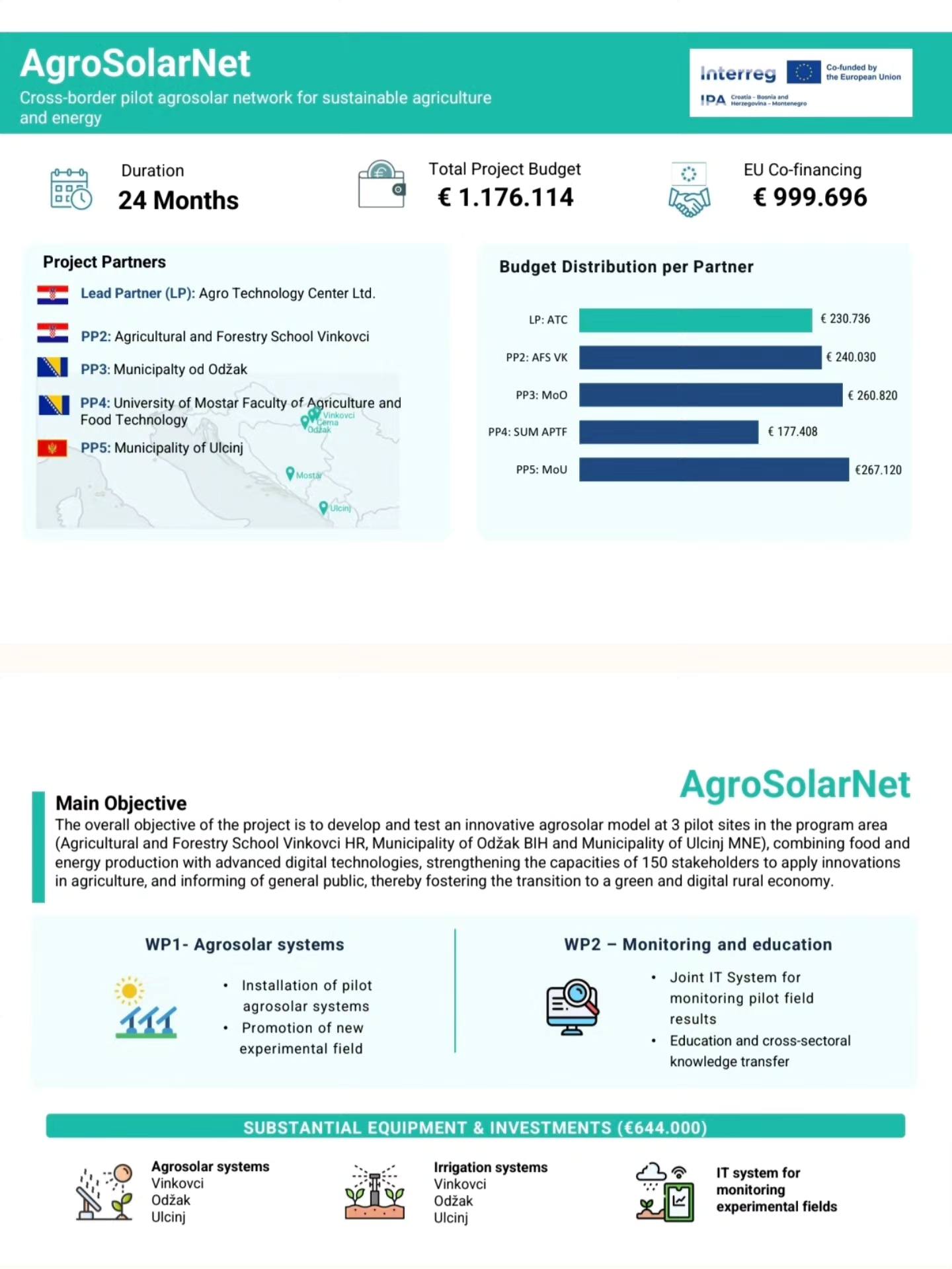 Projekt AgroSolarNet fokusiran je na jedan od najbrže rastućih trendova u svijetu – agrosolare. Glavni cilj je razvoj inovativnih sustava koji omogućuju istovremenu proizvodnju hrane i generiranje obnovljive energije iz sunca na istim površinama.