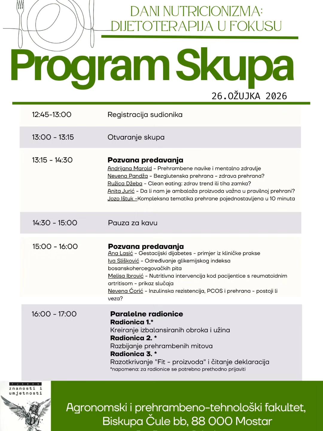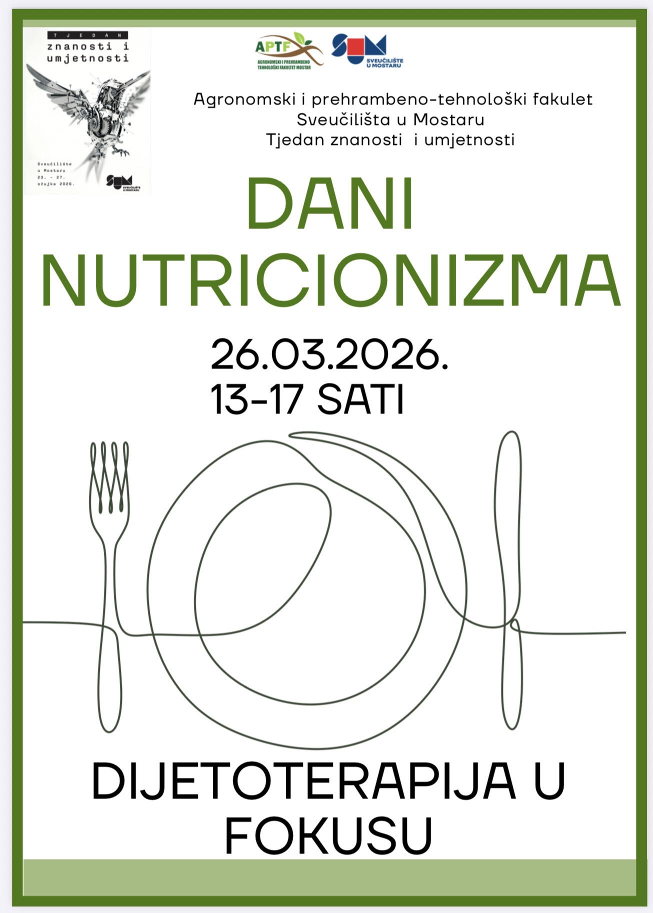 Agronomski i prehrambeno-tehnološki fakultet (APTF) Sveučilišta u Mostaru u četvrtak, 26. ožujka 2026. godine, postaje središte razmjene znanja o zdravlju, hrani i suvremenim trendovima u prehrani.
